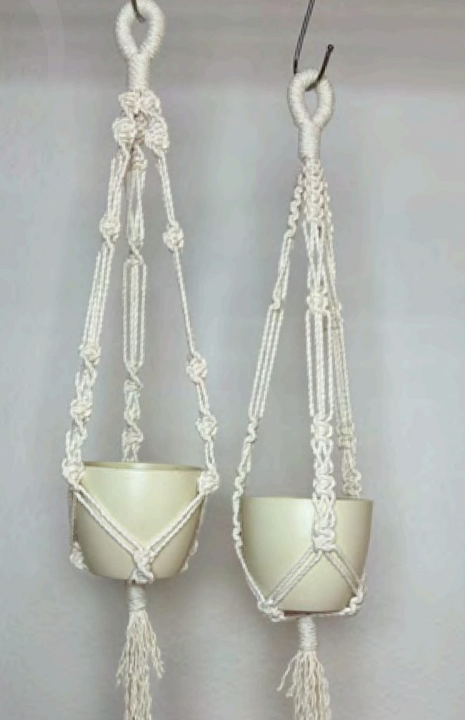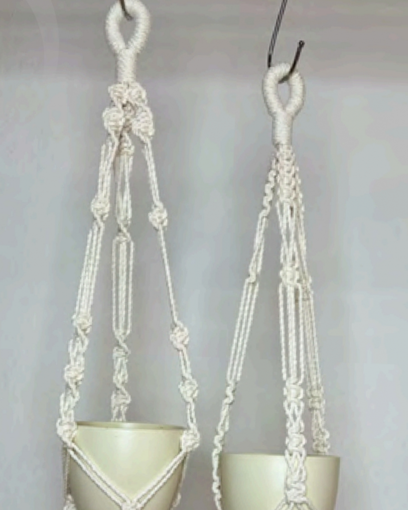Die fertige Blumenampel wird etwa 74 cm lang, inklusive Fransen, und eignet sich für kleine Blumentöpfe bis ungefähr 11 cm Durchmesser.