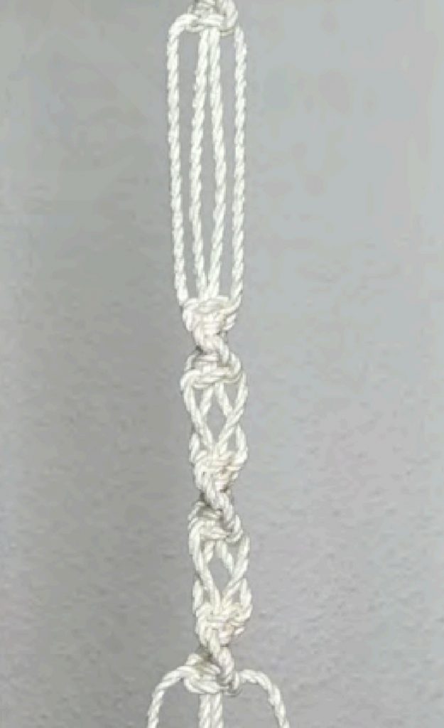 Der Spiralknoten ist eigentlich eine Reihe aus halben Kreuzknoten, die sich automatisch eindrehen und so eine Spirale bilden. Er wird oft für Blumenampeln, Wandbehänge oder Armbänder verwendet.