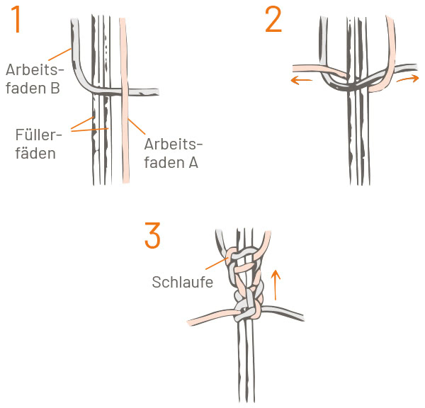 - Lege den rechten äußeren Faden über den linken, dann hinter den mittleren Fäden entlang und durch die Schlaufe links nach vorne.