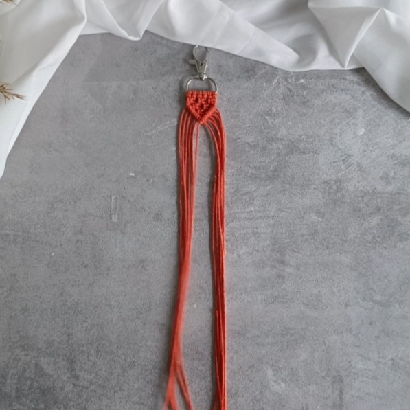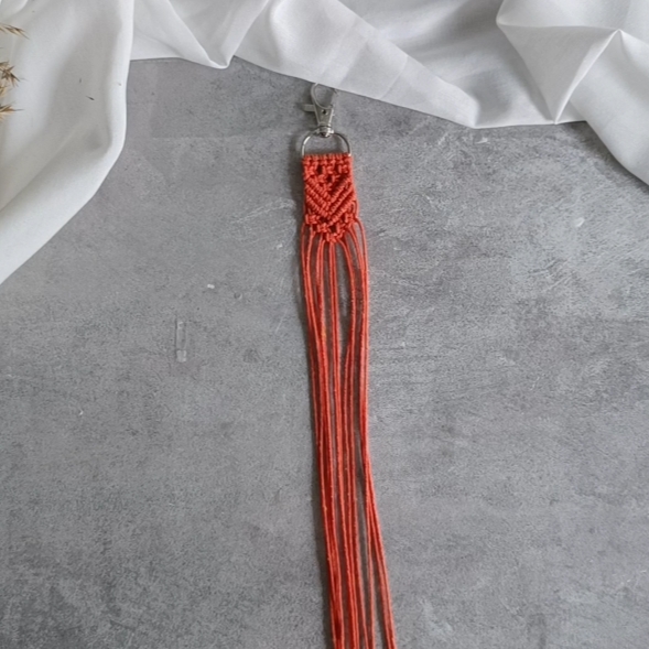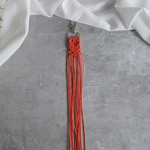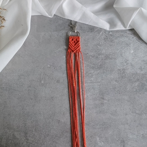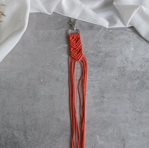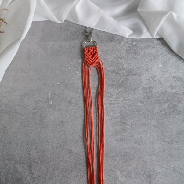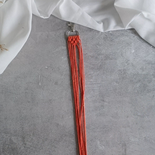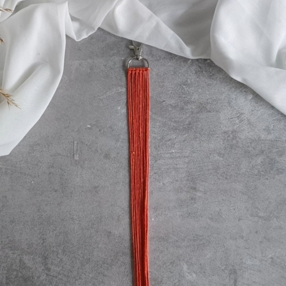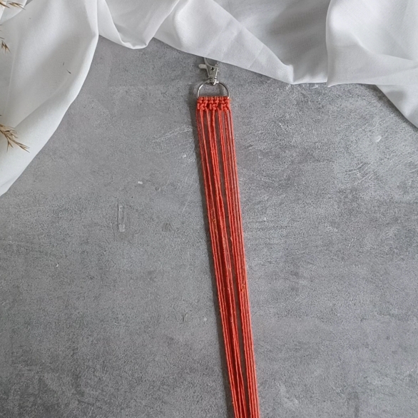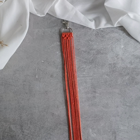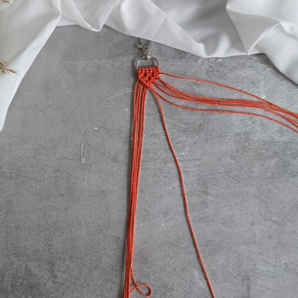 Die sechs 1 m langen Fäden zur Hand nehmen, einzeln zur Hälfte legen und mithilfe von Ankerknoten am Karabinerhaken befestigen.