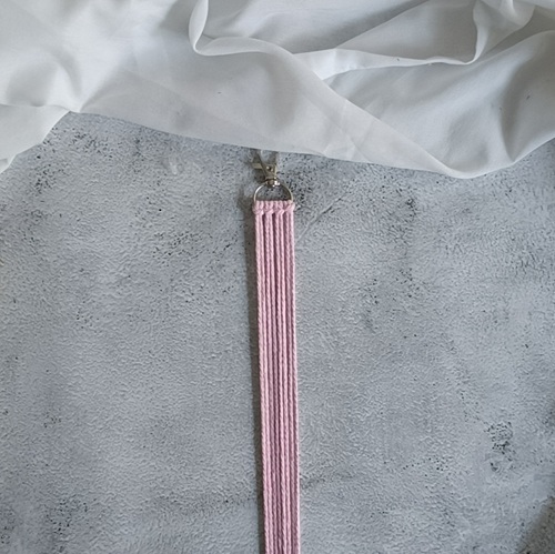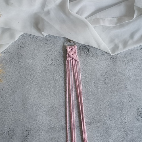 Vier 1m lange Fäden einzeln zur Hälfte legen. Diese mithilfe von Ankerknoten am Karabinerhaken befestigen.