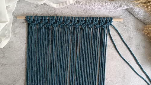 Die 24 Fäden zur Hälfte legen. Diese mithilfe von Ankerknoten am Holzstab befestigen.