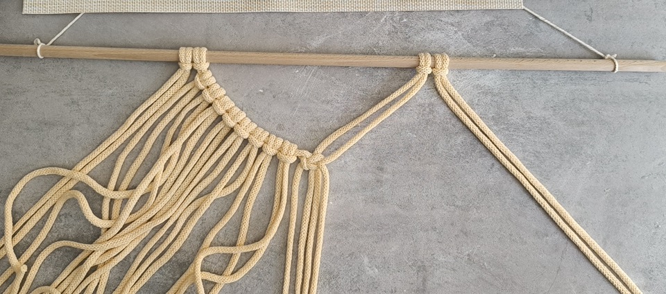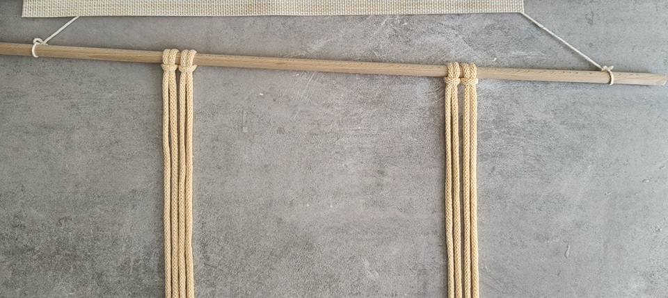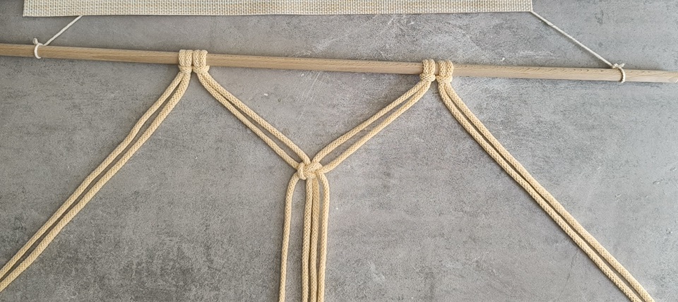 Nun die m langen Fäden zurecht nehmen. Die Fäden einzeln zur Hälfte legen und mit Hilfe von Ankerknoten in den Zwischenräumen der äußersten zwei Fäden anbringen, drei in jedem Zwischenraum.