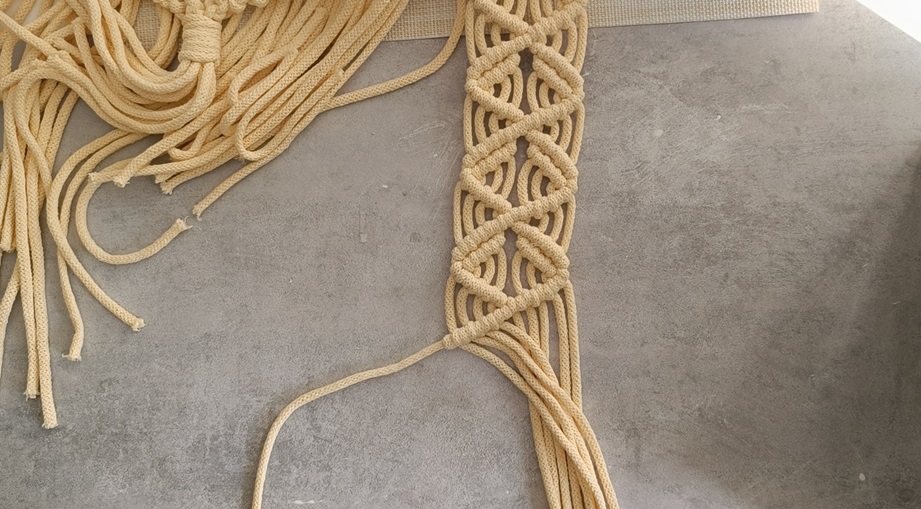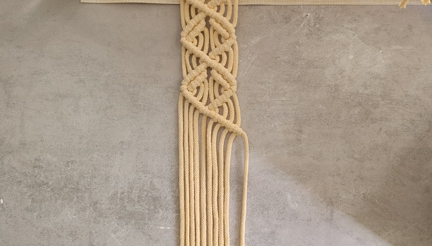 Mit Fäden 3 und 4 einen Strang alternierende Knoten knoten. Dieser Strang sollte so lang sein, dass er in der Mitte des Makramees im Bogen liegend unterhalb des letzten Knotens des Teil 1 zu Ende ist.